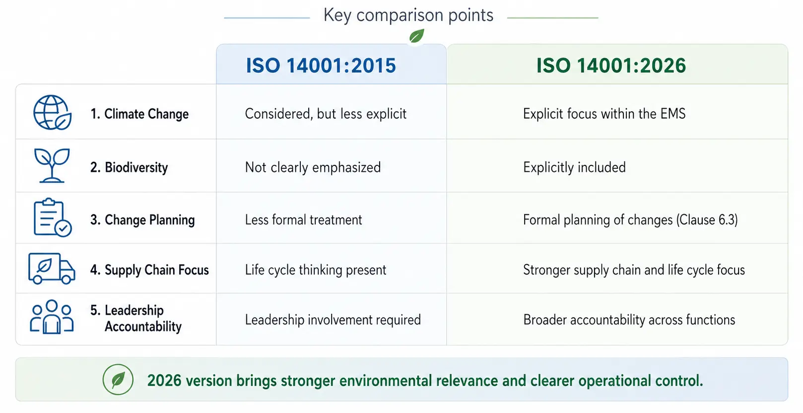 A lot of businesses will search for ISO 14001:2026 vs ISO 14001:2015 because they want to know whether this update is minor or major.